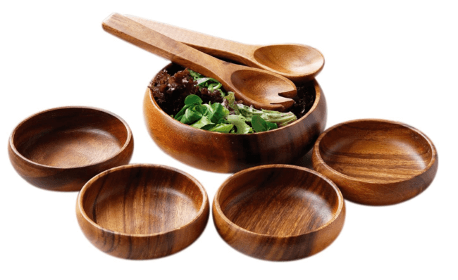 Deze mooie slakom-set is gemaakt van mangohout. De set bestaat uit een serveerkom, een opscheplepel en een vork. De diepe kom maakt het mogelijk een salade op te maken zoals de bedoeling is; de dressing wordt op de bodem van de kom gedaan, de salade wordt toegevoegd, en de twee worden samen gegooid. Veel betere dressingdekking op deze manier!
