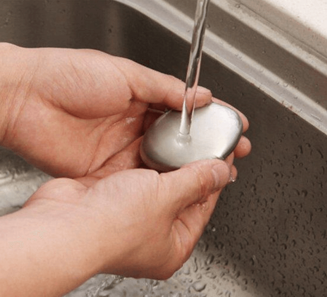 Gewone zeep krijgt de geur van dingen als uien en knoflook niet van je handen. Vreemd genoeg doet je handen wrijven over roestvrij staal dat wel! Je wrijft deze "zeep" over je handen onder stromend water, en de geur verdwijnt. Dit product gaat bovendien levenslang mee!