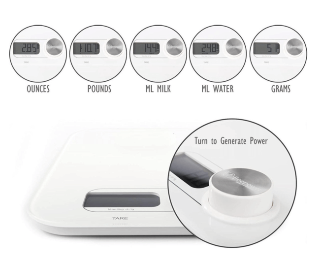 Een keukenweegschaal, maar dan speciaal! Deze weegschaal laad je op door aan de knop te draaien. Erg duurzaam, en je hoeft nooit batterijen te vervangen! Daarnaast heeft deze weegschaal een boel functies. Hij weeg grammen, pounds, ounces, en zelfs mililiters melk!
