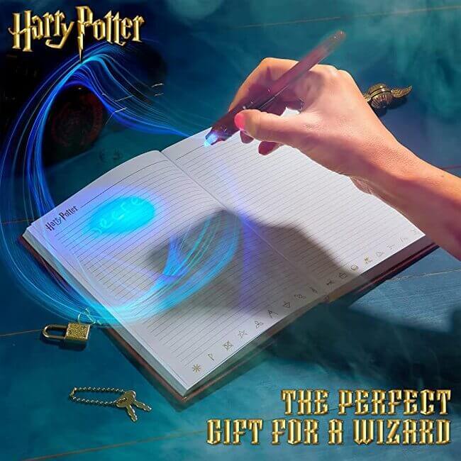 Dit is het perfecte dagboek voor jonge tovenaars! Met deze toverstafpen kun je al je gedachten en avonturen opschrijven zonder dat iemand anders ze kan lezen. De pen schrijft met onzichtbare inkt, maar er zit een speciaal lichtje op de pen dat de inkt weer zichtbaar maakt. Zo kun je zien wat je hebt geschreven en je magische geheimen bijhouden!