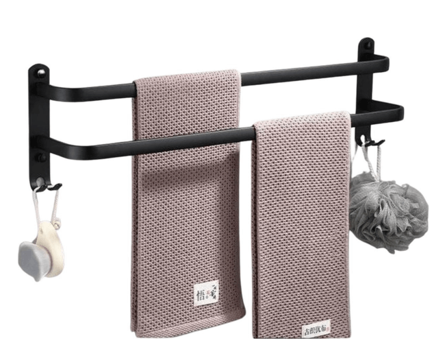 Dit handdoekenrek is een praktische en stijlvolle toevoeging aan elke badkamer. Het is gemaakt van stevige materialen en biedt voldoende ruimte voor twee handdoeken en extra haken voor washandjes of haarnetjes. Eenvoudig te monteren met de bijgeleverde schroeven en pluggen, is het de perfecte manier om je badkamer netjes te houden en je handdoeken van de vloer.